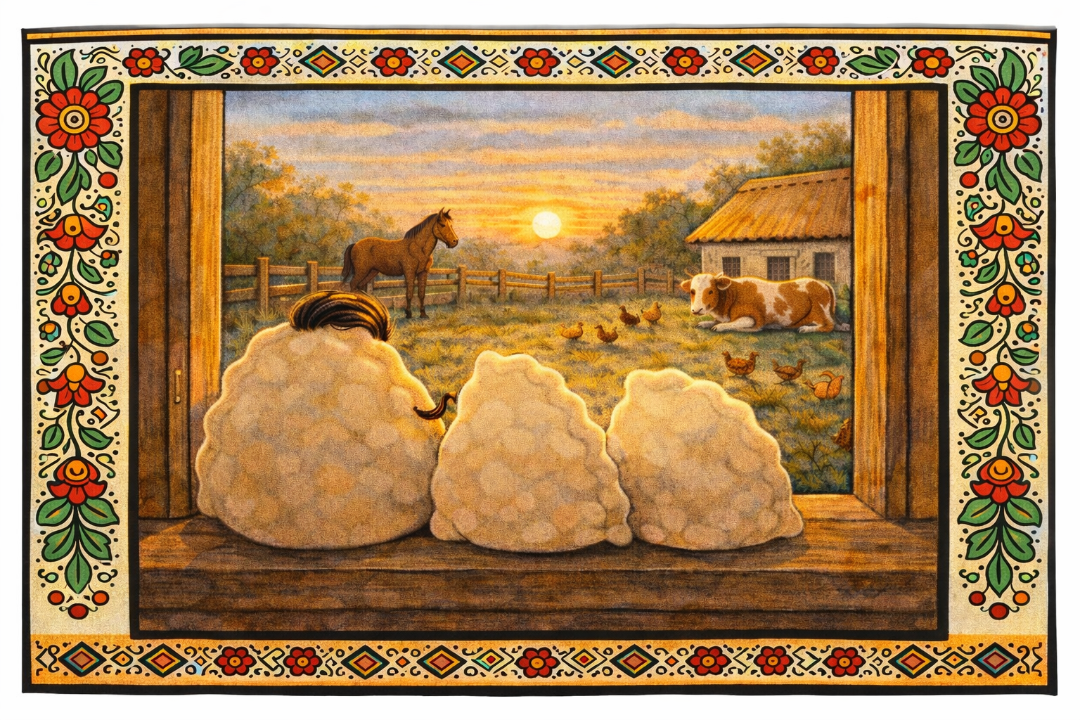 Перед ними відкрився чудовий краєвид господарського двору. Скрізь кипіло життя: у хліві задоволено хрюкали свині, кінь на оборі жував овес і фиркав у широкі ніздрі, неподалік лежала корова, жуючи жуйку. Кози, кури, гуси, качки — все гомоніло.
